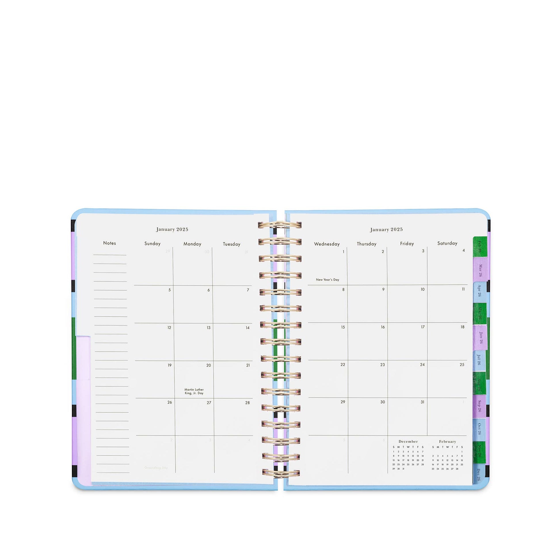 Got big plans? Jot them down in style with the Downtown Stripe 12-Month Planner from Kate Spade New York. Designed for dreamers, doers, and go-getters, this chic planner brings both organization and inspiration to your everyday routine. Featuring signature Kate Spade design details, it combines polished aesthetics with practical functionality—making it the perfect desk companion or gift for anyone who loves to plan beautifully. With thoughtfully designed monthly and weekly spreads, note pages, and charming touches throughout, this planner turns to-do lists into something to look forward to. Its durable hardcover and gold accents reflect Kate Spade’s timeless sophistication and invites you to slow down, reflect, and recharge as you organize your days.