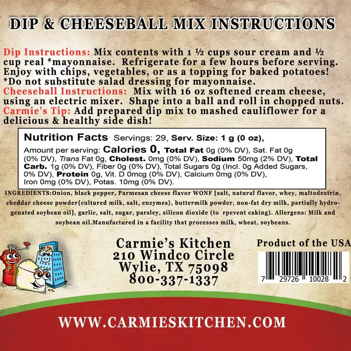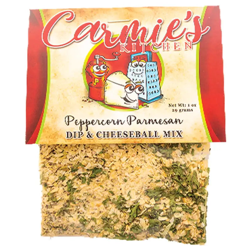 The richness of creamy Parmesan complement garlic and black peppercorns; great with pita chips! Add sour cream or a mixture of sour cream and mayo to create 2 cups of a delicious dip! We recommend serving with potato chips, pretzels, toasted bread slices, or with your favorite vegetables. You can also prepare a cheeseball by adding to 16 oz softened cream cheese. Allergen: dairy Carmie's dip mixes make the perfect stocking stuffer, hostess gift, holiday gift, or holiday party addition!