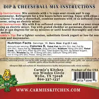 This dip mix is a great mixture of loads of spinach with creamy parmesan and garlic. Add sour cream or a mixture of sour cream and mayo to create 2 cups of a delicious dip! We recommend serving with potato chips, pretzels, toasted bread slices, or with your favorite vegetables. You can also prepare a cheeseball by adding to 16 oz softened cream cheese. Carmie's dip mixes make the perfect stocking stuffer, hostess gift, holiday gift, or holiday party addition!
