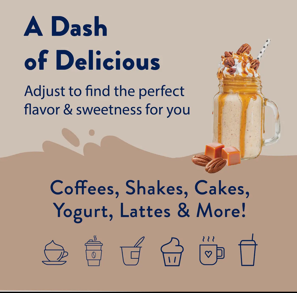 Sweet and luscious caramel combines with buttery pecans to create a unique flavor for your favorite beverages. Add guilt-free flavor to coffees, lattes, tea, protein shakes, smoothies, baking, oatmeal or just about anything.